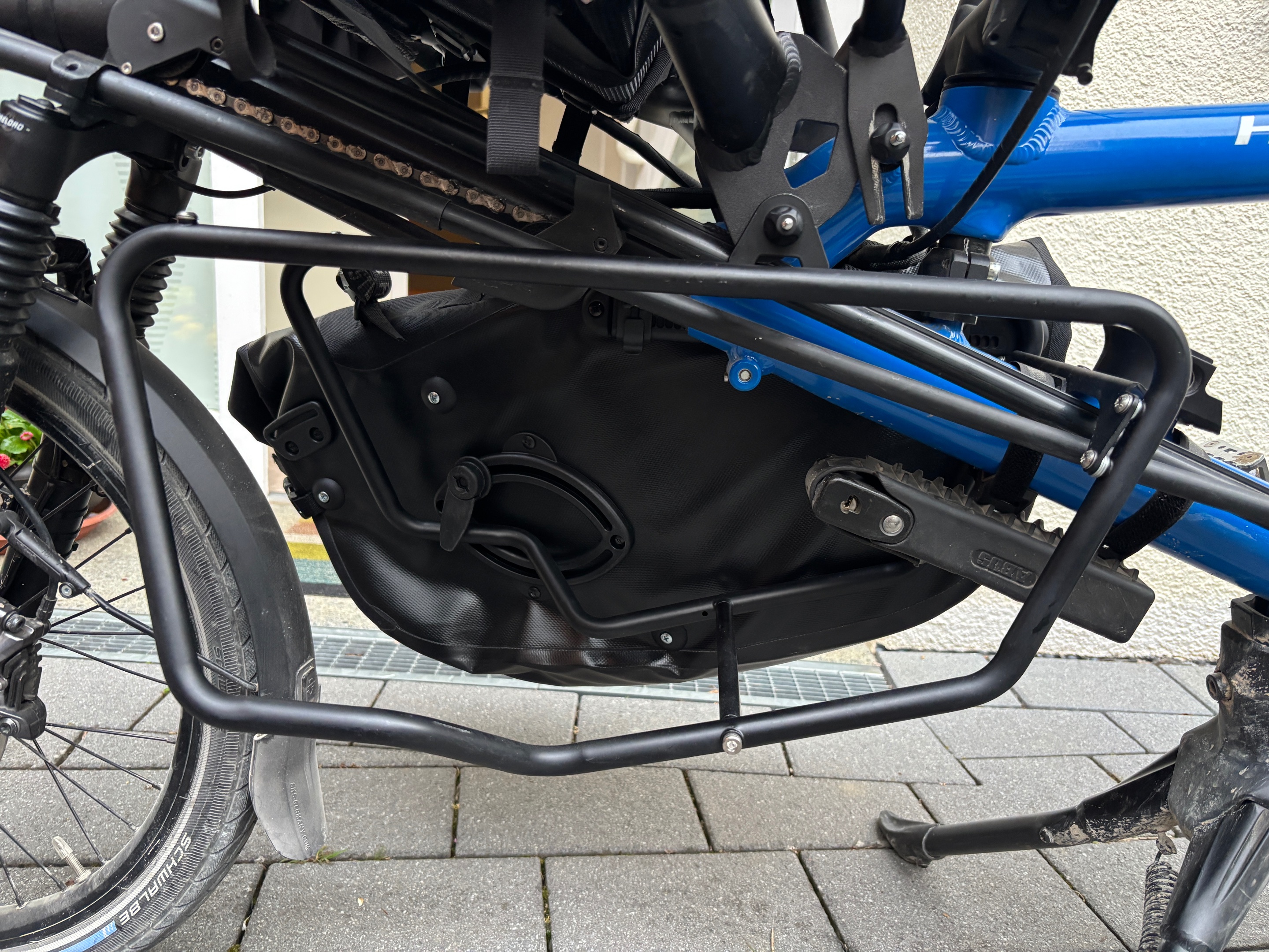 Hier noch mal mit zwei kleinen Ortlieb, Taschen vorne, mit meinem Fuß. Das passt prima.